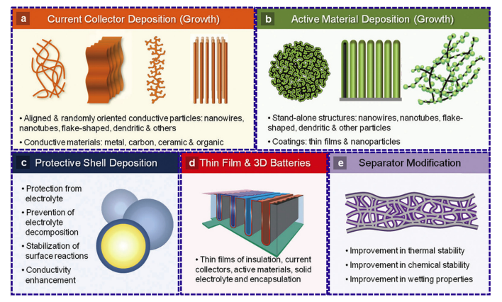 ALD已經(jīng)被公認(rèn)是一種非常有前途的工具可以用來解決鋰離子電池以及其他電能儲存設(shè)備所面臨的問題。ALD在鋰離子電池中的應(yīng)用主要分為兩個(gè)方面:(1)高性能電池電極,隔膜,集流體材料等的制備;(2)表面修飾。其應(yīng)用主要總結(jié)在下圖[1]: