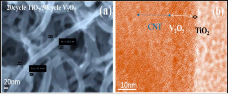 采用ALD技術(shù)制備的負(fù)極材料主要集中在過渡金屬氧化物(TMOs), 如RuO2, SnO2, TiO2和ZnO. 其能量密度比傳統(tǒng)的石墨電極高。同時(shí),為了解決TMOs負(fù)極材料所面臨的挑戰(zhàn),如SnO2在循環(huán)過程中較大的體積變化,TiO2低的電子跟離子電導(dǎo)率,由超高電導(dǎo)率的碳基材料如石墨烯,碳納米管以及Mxenes與TOMs組成的復(fù)合負(fù)極材料可以很好的融合兩者的優(yōu)勢。