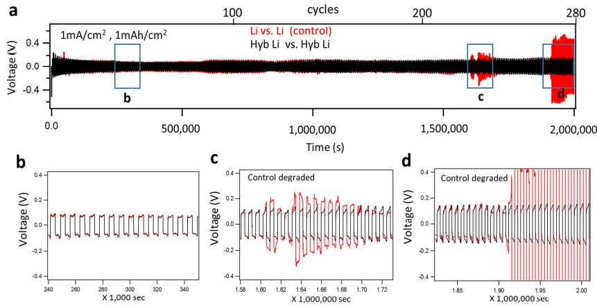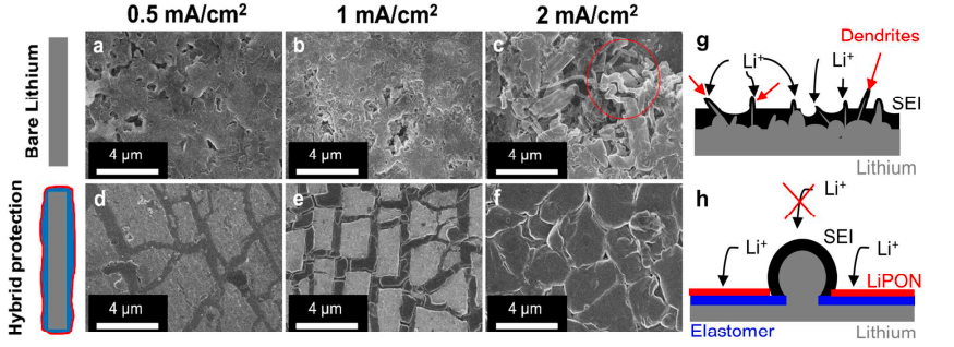 鋰金屬作為負(fù)極材料的未來之星,在鋰金屬的沉積跟剝離過程中,鋰枝晶的生長導(dǎo)致電池短路的問題亟待解決。采用ALD技術(shù)在鋰金屬表面構(gòu)建例如有機(jī)/無機(jī)復(fù)合人工SEI膜,可以有效地抑制鋰枝晶的生長[5]。