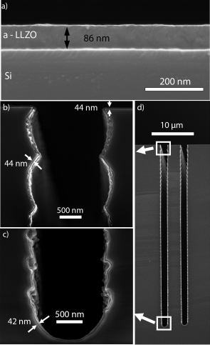 歸功于其安全性及循環(huán)穩(wěn)定性,全固態(tài)鋰離子電池近來成為了研究的熱點(diǎn)。ALD可以解決全固態(tài)鋰離子電池所面臨的兩大關(guān)鍵性挑戰(zhàn):a.高界面阻抗,b.低離子電導(dǎo)率。 最近采用ALD制備的固態(tài)電解質(zhì)有LiPON, Li7La3Zr2O12, LixAlySizO, LixTayOz, LixAlyS and Li2O-SiO2.這些含鋰SSEs提供了一個(gè)關(guān)鍵的技術(shù)平臺來制備高能量密度,長壽命以及安全的可充放電池。如下圖所示,ALD制備的LLZO為制備3D全固態(tài)鋰離子微電池提供了一條技術(shù)路線[4]。