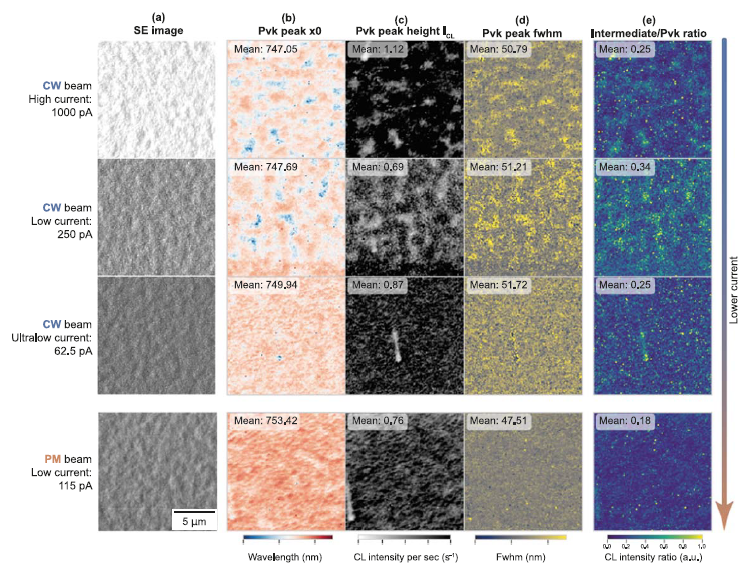 在優(yōu)化的采集條件下,使用脈沖電子束,可以通過(guò)CL高光譜圖的采集來(lái)解決雜化鈣鈦礦薄膜發(fā)射特征的不均勻性。