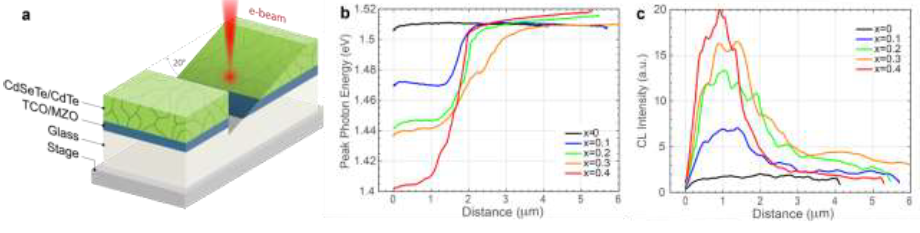 峰值光子能量和CL強(qiáng)度與薄膜深度的相關(guān)性。a) 斜面樣品CL實(shí)驗(yàn)示意圖。b) 作為與CdSeTe/MgZnO界面距離的函數(shù),平行于結(jié)平均的峰值光子能量和c)CL強(qiáng)度。