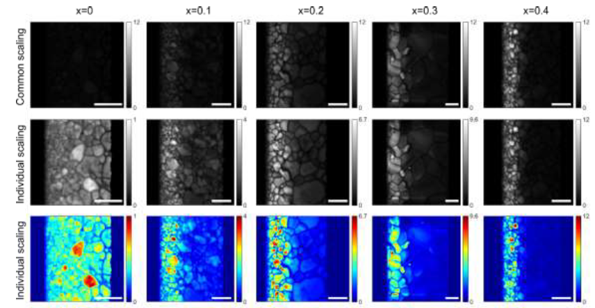 成分x值在0%至40%范圍內(nèi)的傾斜CdSexTe1-x樣品的CL強(qiáng)度。最上面的一行表示右側(cè)圖例中顯示的普通縮放的強(qiáng)度。中間一行對(duì)每個(gè)構(gòu)圖使用單獨(dú)的縮放來(lái)增強(qiáng)每個(gè)構(gòu)圖的對(duì)比度。下一行用顏色表示第二行的結(jié)果,以增強(qiáng)整個(gè)膜的可視化,特別是對(duì)于更高的Se濃度。右側(cè)圖例提供了比例。白色條對(duì)應(yīng)于沿著傾斜表面的5微米。