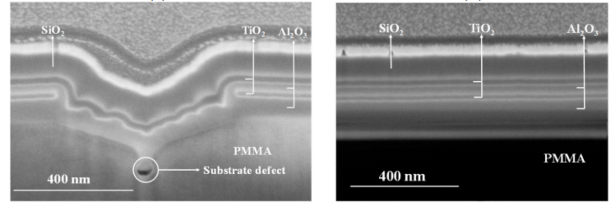 ALD薄膜以飽和吸附的layer-by-layer生長模式,可在結構復雜的幾何表面,如大曲面及高縱深比深孔結構,大面積形成高均勻性薄膜,且膜層相較于PVD膜更為致密,在界面處的結合力更強(圖2-3),更適用于未來工業(yè)界先進精密光學器件的制造。