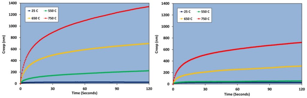 調(diào)查發(fā)現(xiàn),大多數(shù)高溫材料的失效是由高溫、高壓作用引起的高溫蠕變所致。不同材料的組織、化學(xué)成分和熱物理性能都存在著較大的差異,因此其蠕變性能的高低也不盡相同。例如,低合金鋼和不銹鋼之間的蠕變性能就存在很大的差異。鑒此,研究材料的高溫蠕變特性就顯得尤為重要。而納米壓痕技術(shù)提供了一個(gè)獨(dú)特的機(jī)會來探測復(fù)雜微觀結(jié)構(gòu)材料中單個(gè)組分或相的蠕變反應(yīng),這是傳統(tǒng)的測試技術(shù)無法實(shí)現(xiàn)的。納米力學(xué)測試系統(tǒng)NanoTest Vantage(-25°C至850°C)和NanoTest Xtreme(-50°C至1000°C)以其行業(yè)領(lǐng)先的熱穩(wěn)定性以及測量最廣泛樣品幾何形狀的靈活性成為高溫蠕變反應(yīng)測量的不二選擇。如下圖示例: