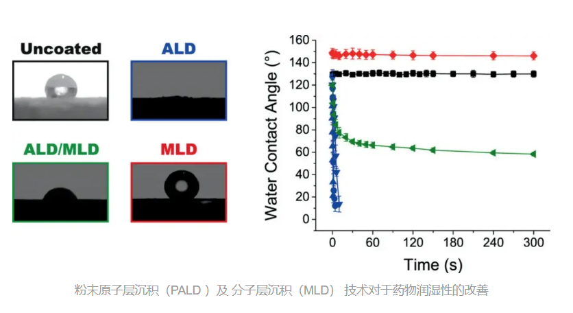 制藥?業(yè)依賴于對活性藥物成分 (API) 以及各種輔藥在內(nèi)的藥物粉末進(jìn)?加?。藥物粉末被加?成?囊,?劑、丸劑、吸?劑或眼科治療劑(滴眼液)。由于藥粉多為有機(jī)固體,其流動(dòng)性、潤濕性、壓實(shí)性和分散性較差,精確劑量的藥粉制造?藝既昂貴?耗時(shí)。通過粉末原子層沉積 PALD 技術(shù)可以改善粉末的流動(dòng)性、壓實(shí)性和顆粒分散性。