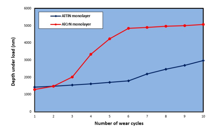 在下面的示例中,對(duì)硬質(zhì)合金上的單層AlTiN和AlCrN刀具涂層進(jìn)行了1 N次重復(fù)磨損試驗(yàn)。1 N的磨損載荷使峰值應(yīng)力位于涂層和基材之間的界面,增加了對(duì)附著力差異的敏感性。在斜坡載荷微劃痕測(cè)試中,AlCrN涂層具有比AlTiN (4.5 N)更高的臨界載荷(5.7 N),并且最初在1 N時(shí)具有更強(qiáng)的抗劃痕性。然而,由于較弱的附著力,AlCrN在幾個(gè)周期內(nèi)迅速失效,而AlTiN則表現(xiàn)出更緩慢的磨損。