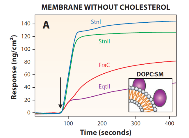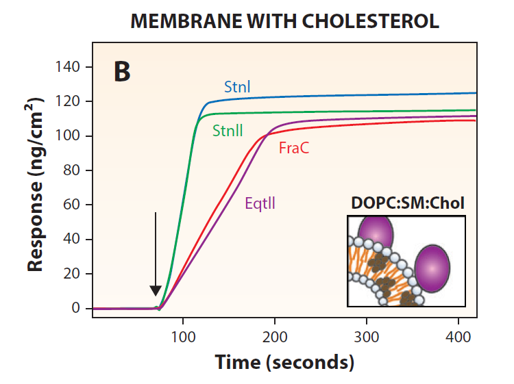 圖1。海葵放線(xiàn)素(成孔毒素)與脂質(zhì)膜結(jié)合導(dǎo)致細(xì)胞死亡。采用MP-SPR法測(cè)定Equinatoxin II (EqtII)、fragaceatoxin C (FraC)、sticholysin II (StnII)和sticholysin I (StnI)與脂質(zhì)囊泡的結(jié)合。