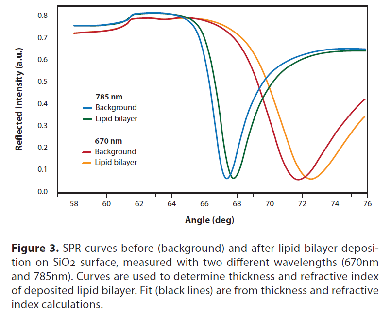 脂質(zhì)體或脂雙分子層形式的支撐脂層可以沉積在SPR傳感器載玻片上。MP-SPR是一種在不知道沉積層厚度和折射率的情況下確定沉積層厚度和折射率的獨(dú)特方法。支持脂質(zhì)層可以進(jìn)一步用于藥物發(fā)現(xiàn)和開發(fā)、生物傳感和生物物理學(xué)等領(lǐng)域,以確定分子與脂質(zhì)層的相互作用。