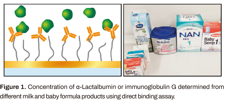 樣品是從芬蘭超市購(gòu)買的不同的奶制品(圖1)。粉末樣品根據(jù)包裝上的說(shuō)明制備成液體形式,并進(jìn)一步稀釋1000或50倍(正常牛奶)和5000倍(嬰兒產(chǎn)品)。使用90秒的樣品注射(校準(zhǔn)或牛奶樣品),120秒的等待時(shí)間和60秒的ALAB再生注射進(jìn)行測(cè)量。IgG注射時(shí)間較長(zhǎng)。ALAB的校準(zhǔn)范圍為0 - 1000 ng/mL, IgG的校準(zhǔn)范圍為0 - 75 000 ng/mL。校正曲線符合4參數(shù)Low-High方程,也可用于測(cè)定樣品中的蛋白質(zhì)濃度。