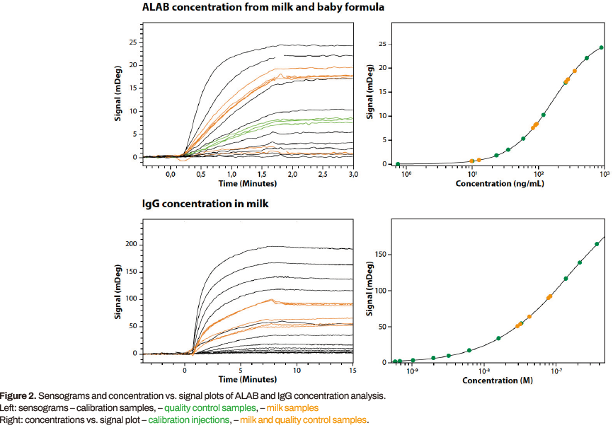 采用多參數(shù)表面等離子體共振(MP-SPR)儀器可以測(cè)定牛奶和乳基嬰兒配方奶粉中蛋白質(zhì)的濃度。α-乳清蛋白(ALAB)是嬰兒重要的營(yíng)養(yǎng)蛋白,免疫球蛋白G (IgG)是二次免疫應(yīng)答的重要組成部分。根據(jù)校準(zhǔn)曲線確定未知樣品的濃度。該試驗(yàn)是使用固定在表面的抗alab抗體或抗igg抗體的直接結(jié)合試驗(yàn)。同樣的分析格式可用于檢測(cè)其他類似的感興趣的蛋白質(zhì),如抗生素殘留、毒素、過(guò)敏原或營(yíng)養(yǎng)物質(zhì)。