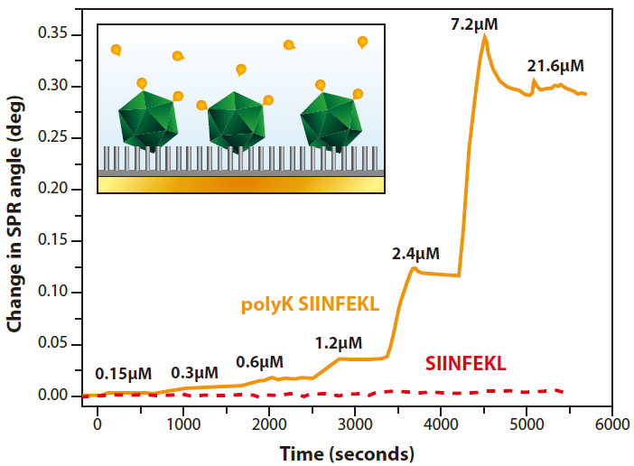 修飾的帶正電荷的PolyK-SIINFEKL在oad上的吸附表現(xiàn)出濃度依賴性,而未修飾的中性SIINFEKL不與病毒結(jié)合(圖2)。PolyK-SIINFEKL的結(jié)合常數(shù)為2.88 x 10-6 M。