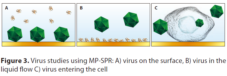 使用MP-SPR可以利用各種實(shí)驗(yàn)裝置進(jìn)行病毒相互作用測(cè)量。如圖3所示,病毒可以像這里描述的那樣附著在傳感器表面(作為配體)或中間所示,它們可以在液體流動(dòng)中自由移動(dòng)(作為分析物),而靶標(biāo)在表面或細(xì)胞可以附著在傳感器表面。與此同時(shí),病毒正在進(jìn)入細(xì)胞,如圖所示。如利用MP-SPR技術(shù)研制玉米綠斑病毒(MCMV)檢測(cè)生物傳感器時(shí),以病毒為分析物。