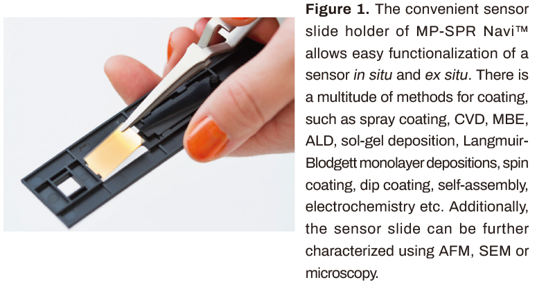 MP-SPR可以測(cè)量分子的吸附,同樣的測(cè)量也提供了層厚度和光學(xué)性質(zhì)的信息。對(duì)于大多數(shù)透明材料,測(cè)量的層厚度范圍可以從納米到微米。層表征可以在空氣和各種溶劑中無(wú)縫地完成,而不需要改變儀器設(shè)置。與MP-SPR一起使用的彈性體涂層棱鏡允許無(wú)油操作,結(jié)合方便的傳感器滑動(dòng)支架(圖1),可以使用其他方法(如AFM或SEM)進(jìn)一步表征涂層。此外,傳感器滑動(dòng)片可以很容易地在原位和非原位涂覆。