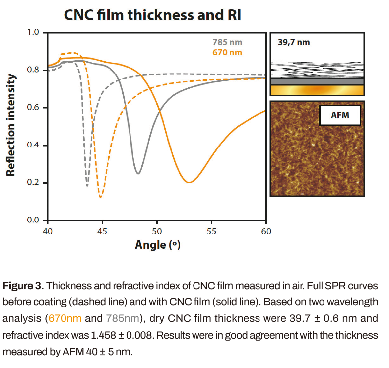 采用硫酸水解法制備CNC。CNC尺寸為4 ~ 15 nm × 50 ~ 306 nm,平均長(zhǎng)度分別為8 nm和122 nm,由AFM測(cè)量100個(gè)顆粒。用水虎魚(yú)溶液(3:1濃硫酸:雙氧水)清洗SiO2涂層的SPR傳感器載玻片。cnc在氮?dú)庵幸?000 rpm的轉(zhuǎn)速旋轉(zhuǎn)30 s,加減速時(shí)間為7秒。通過(guò)改變CNC懸浮液濃度在1到3個(gè)重量百分比之間來(lái)控制層厚度。傳感器載玻片在80°C下熱處理8小時(shí),以去除薄膜中的水分,然后進(jìn)行保濕和再加熱(過(guò)夜),以減少薄膜中的取向。