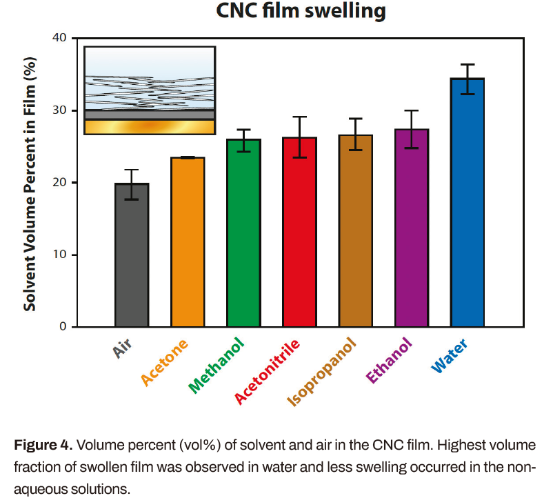 與干燥的CNC膜相比,水膨脹的CNC膜的厚度增加了14±2%。有機(jī)溶劑使親水性CNC膜的體積增加小于水:丙酮增加4%,甲醇、乙腈、異丙醇和乙醇增加6 - 8%。溶劑的氫鍵能力與膜的溶脹程度密切相關(guān)。然而,是非質(zhì)子型的高極性乙腈。