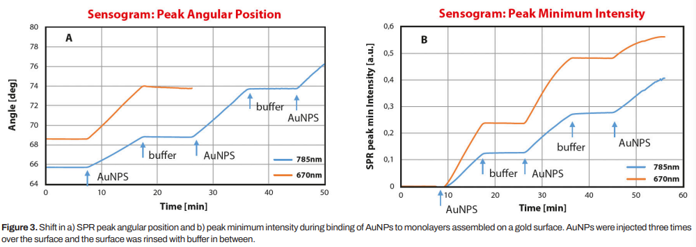 使用BioNavis SPR Navi?210A-L儀器在670和785nm兩個(gè)波長(zhǎng)下測(cè)定AuNPs與表面單層的結(jié)合。用水沖洗單層表面,測(cè)定基線,以10 μL/min的速度在表面注入AuNPs,持續(xù)約10分鐘。AuNP注射三次,每次注射之間用水沖洗。