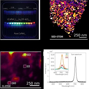 Ps:混合鹵化鉛鈣鈦礦和金屬有機(jī)骨架復(fù)合材料顯示出顯著的穩(wěn)定性和發(fā)光效率(左上)。掃描透射電子顯微鏡(STEM)的納米級電子衍射允許人們識別單個CsPbX3納米晶體的相(右上角)。最后,STEM上的陰極發(fā)光(CL)表明光來自單個納米晶體(左下),它們的發(fā)射光譜(右下)非常相似。