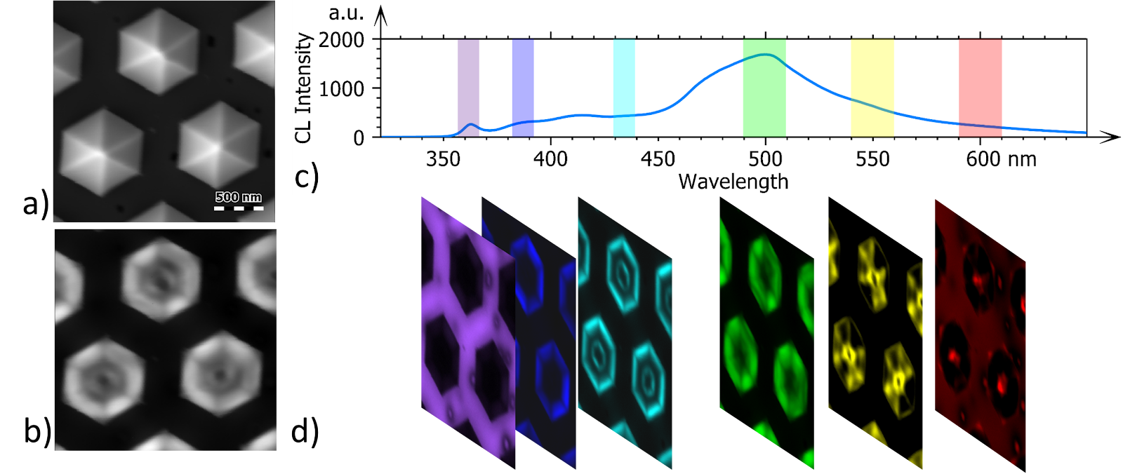 1、GaInN/GaN多量子殼納米線微發(fā)光二極管(MicroLED)是下一代顯示設備的有力競爭者。利用CL超光譜成像技術可以對它們的發(fā)光特性進行詳細表征。下圖a和b展示了從頂部視角獲取的結構的二次電子(SE)和全色CL強度圖像。圖c展示了整個圖像的平均發(fā)射光譜。通過在不同波長范圍(通常在發(fā)射峰附近)上積分發(fā)射強度,可以得到不同的圖像(圖d),稱為彩色帶圖像,這些圖像可以代表堆疊中的特定材料或一種材料的特定特性。