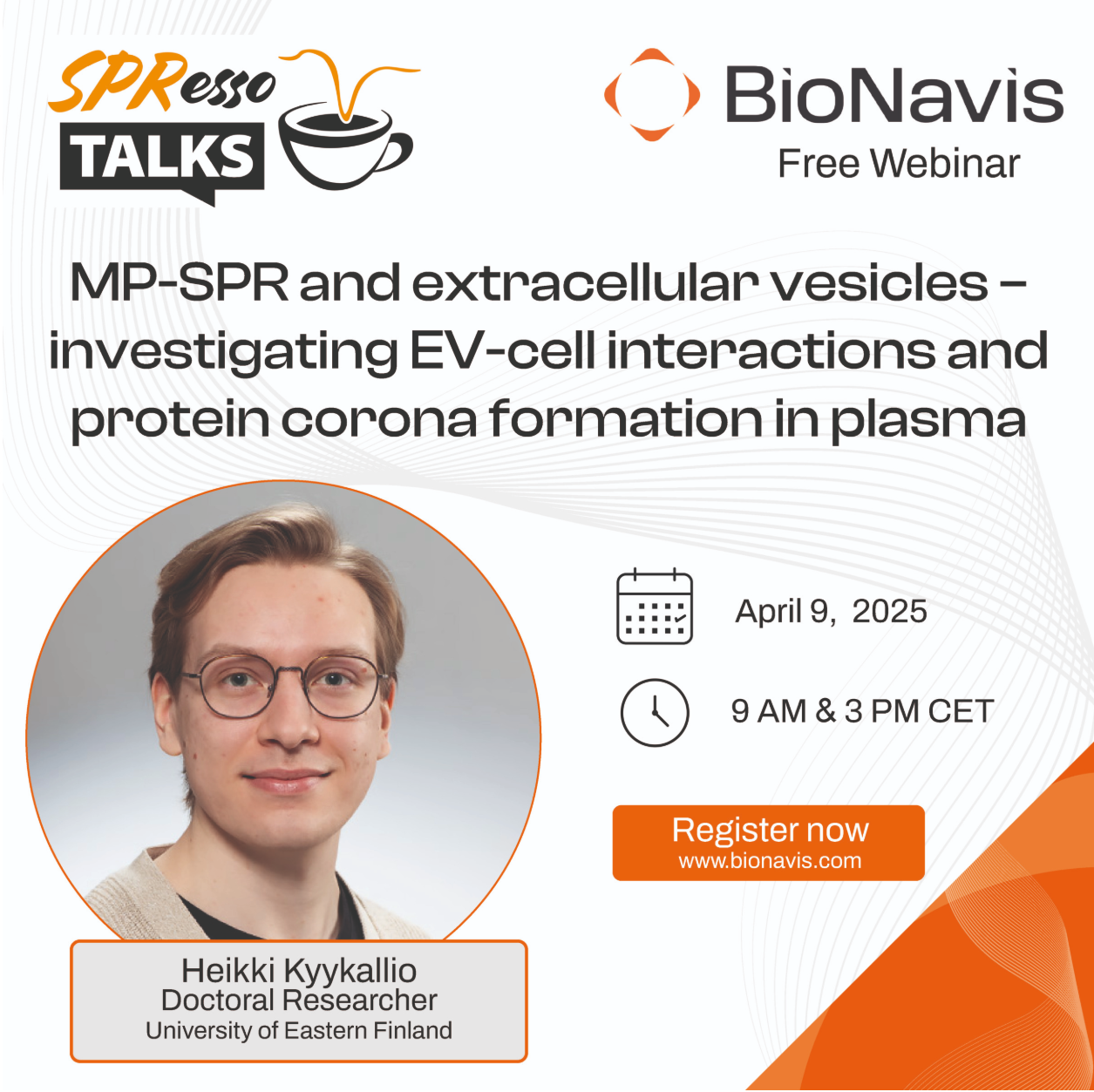 BioNavis非常高興能邀請(qǐng)到博士研究員Heikki Kyykallio來(lái)分享他在利用MP-SPR(多參數(shù)表面等離子體共振)以無(wú)標(biāo)記方式研究 EV(細(xì)胞外囊泡)相互作用方面的最新研究成果。他將展示如何利用MP-SPR來(lái)捕獲和表征EV的亞群,研究透明質(zhì)酸表面修飾對(duì)細(xì)胞相互作用的影響,并揭示這些修飾如何影響血漿中的蛋白質(zhì)冠形成。和我們一起來(lái)探索MP-SPR如何推進(jìn)細(xì)胞外囊泡的研究。