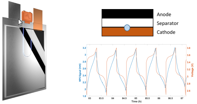 LFP/石墨硬幣電池中恒流(CC)測(cè)量期間的NPS信號(hào)(藍(lán)色)和電壓(橙色)。傳感器放置在陰極-隔膜界面處。觀察到NPS信號(hào)與累積電荷之間存在非線性相關(guān)性。